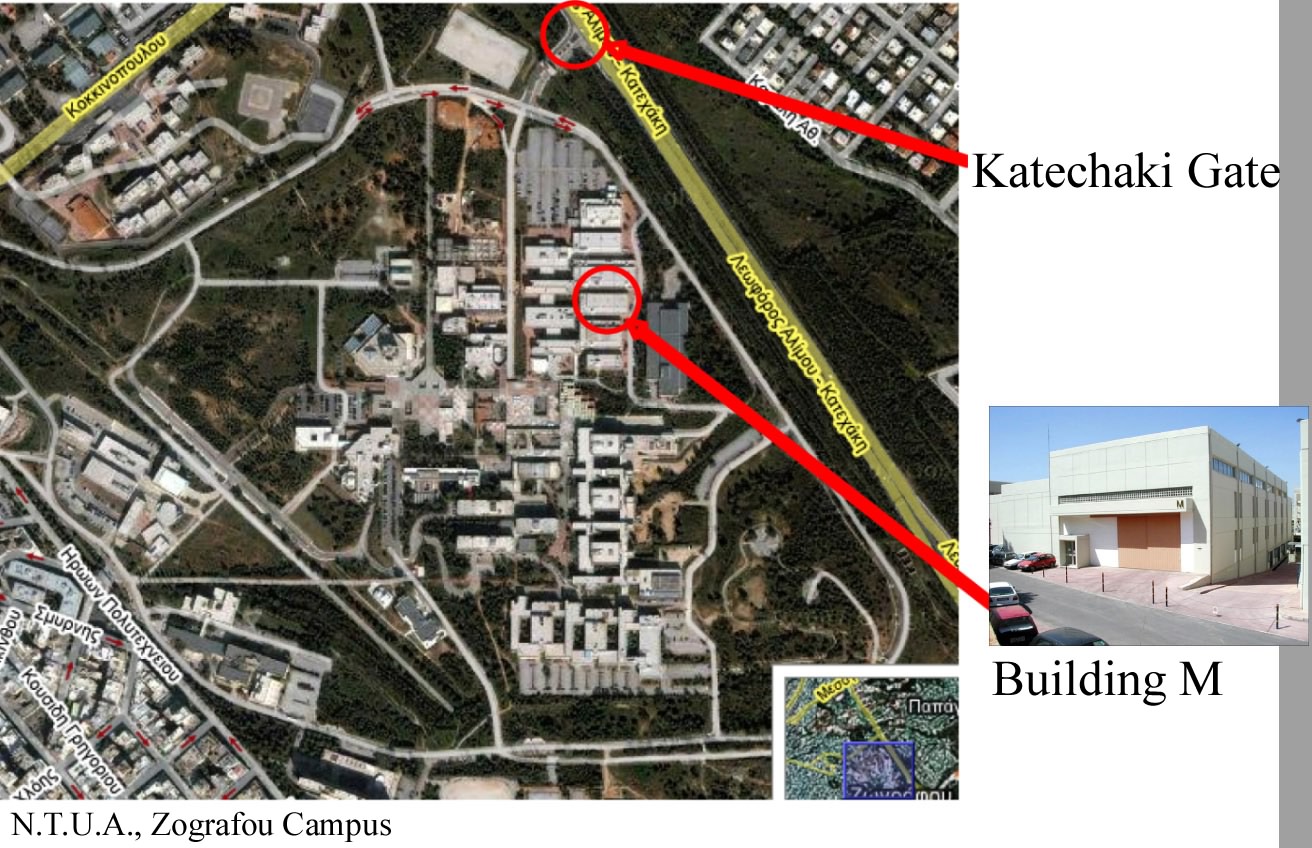 The School of Mechanical Engineering is located at the NTUA Zografou Campus. The map shows the location of the Department. The Katehaki entrance is always open to traffic.